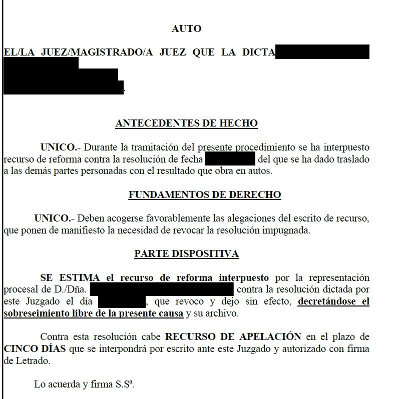 Nuestra estrategia consistió en una defensa procesal. En primer lugar, forzamos el cambio de Juzgado por falta de competencia. Lo hicimos así porque no nos gustó el tono del Juez Instructor en el interrogatorio a nuestra cliente. En segundo lugar, una vez en el nuevo Juzgado, aprovechando los errores de la parte contraria y los vericuetos procesales de esta clase de procedimiento, pedimos el Sobreseimiento Libre, por motivos procesales y sustantivos. El Juzgado nos dio la razón en aspectos procesales, sin embargo sólo dictó un Auto de “Archivo”, aduciendo que no procedía el sobreseimiento.  Pero en Segrelles Abogados, no nos rendimos. Al contrario, esto nos obligó a recurrir dicho Auto de Archivo pidiendo, una vez más el Sobreseimiento Libre. Finalmente, el Juez de Instrucción, consciente de que teníamos razón, acogió nuestros argumentos procesales y dictó Auto de Sobreseimiento Libre.
